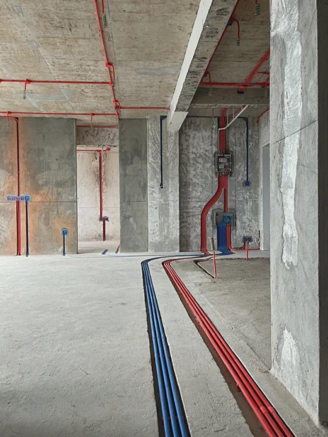 线管分色:强电(照明、插座)用红色线管,弱电用蓝色线管,强弱电交叉处用锡箔纸包裹,减少信号干扰。
