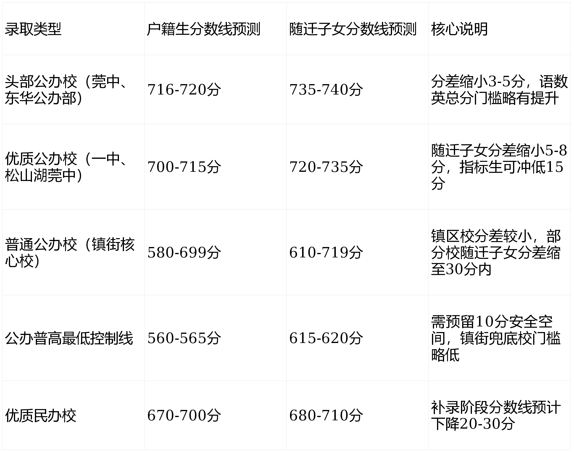•莞城:公办校密度最高,头部校(莞中、一中)户籍生703分以上,随迁子女728分以上,普通公办校户籍生650分+。