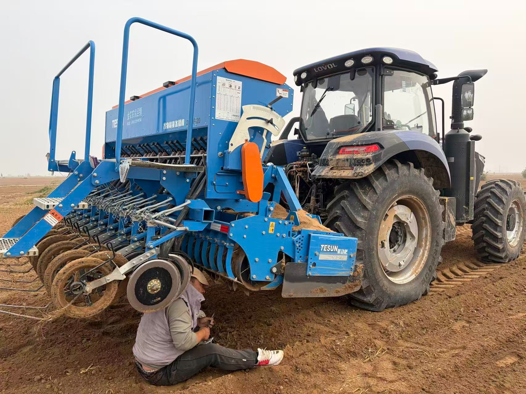 10月30日,邯郸市永年区的一位驾驶员正在修理播种机(央广网发 张胜坡摄)